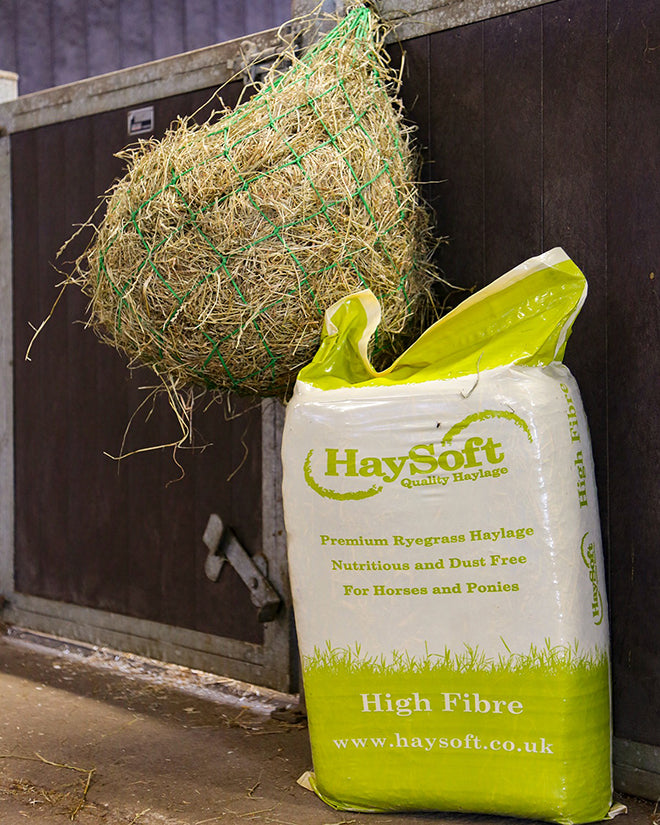 HaySoft High-Fibre is made from the best rye grass cut early in May or June when nutritional values are high, blended with timothy hay. This provides the horse with forage that has far higher levels of vitamins, minerals and protein than that of just hay, making HaySoft High-Fibre the choice haylage for horse owners.